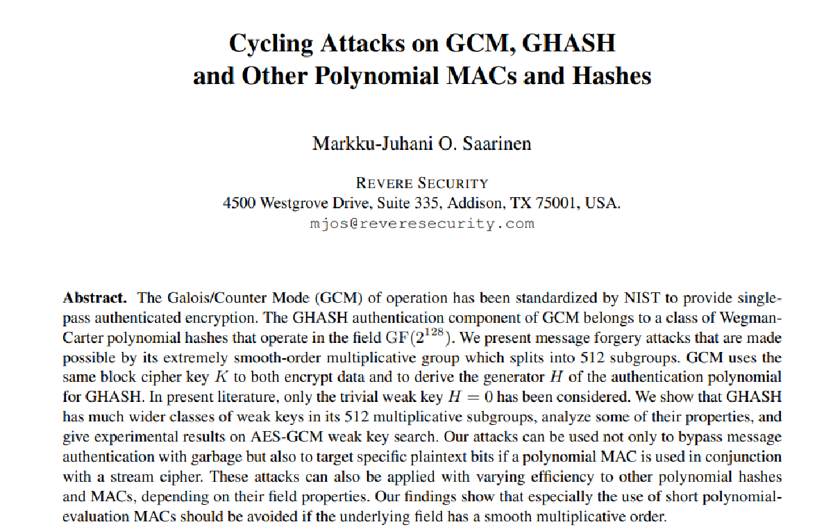 For those interested in the deep technical details, the original research paper for this attack can be found here: Weak Keys in the GCM Mode of Operation (Saarinen, 2011).